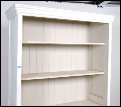 A 20th century shabby chic tall painted window open library bookcase cabinet having a plinth base with a series of shelves under flared cornice atop