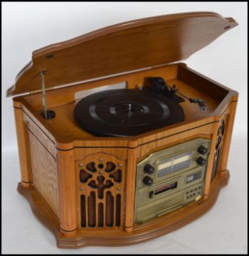 A Steepletone oak cased antique style hi-fi with inset record deck, cd, radio and tape deck. Bought and never used, the record deck still in packing