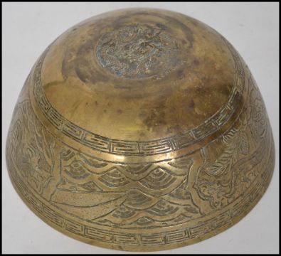 A 20th century Chinese bronze ding bowl, Greek key borders, dragon and birds of paradise chased decoration, Chinese character marks to base. Measures 24cms wide.