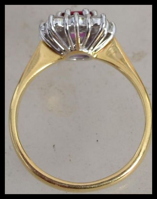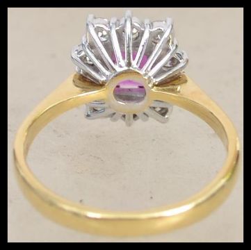 A hallmarked 18ct gold diamond and red stone ring set with a central emerald cut red stone surrounded by a halo of diamonds. Diamonds approx 50 pts. Total weight 4.3g. Size P.