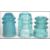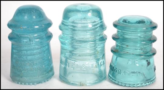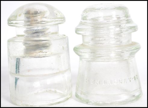 A group of 8 American vintage glass electricity pylon insulators, in green and clear glass, makers to include Hemingray and An. Tel and Tel. Co.