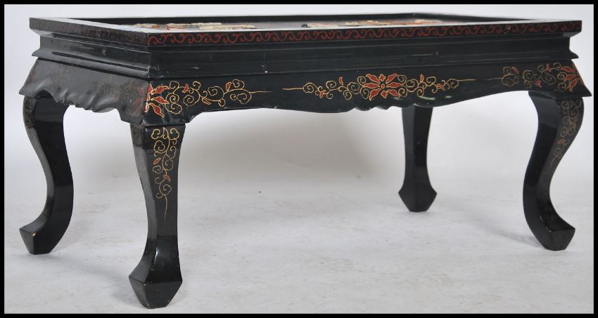 A mid century Chinese ebonised folding coffee table adorned and inset with soapstone and agate scenes, the unusual table with folding legs