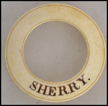 A early to mid 19th century ivory wine bottle neck ring with applied notation for Sherry in black lettering.