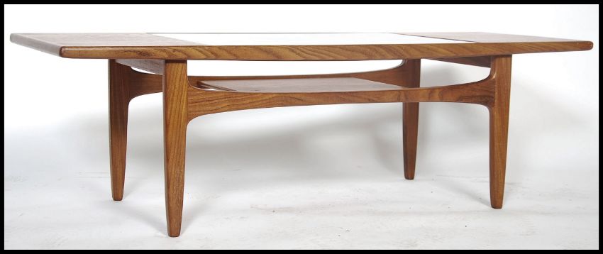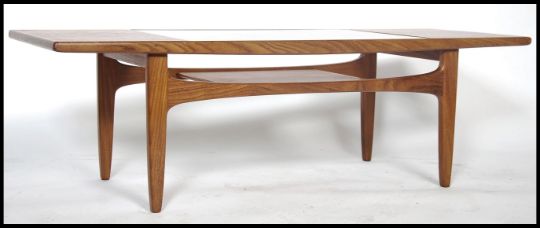 A retro 1970's teak wood G Plan long John coffee table with drop in glass top with exposed slated under tier / magazine rack. Measures 43cm high x 137cm wide x 51cm deep.
