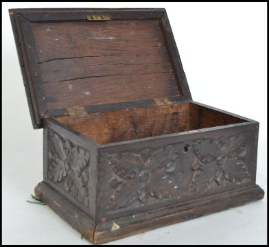 A 19th century Jacobean revival caved oak box, having carved leaf fauna panels, lift up lid with brass lock and working key.