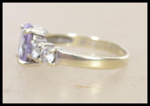 A hallmarked 9ct gold ring set with an oval cut purple stone flanked by four round cut CZ. Hallmarked Birmingham. Weight 2.5g. Size L.