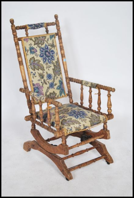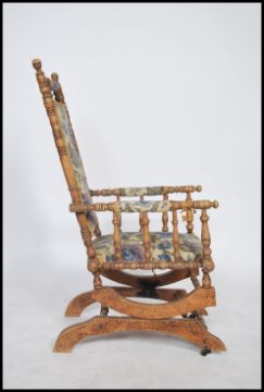 A Victorian mahogany aesthetic movement Boston Rocker - American Rocking chair. Raised on sleigh base with sprung rock action, upholstered seat with gallery arms. 110cms x54cms x 70cms