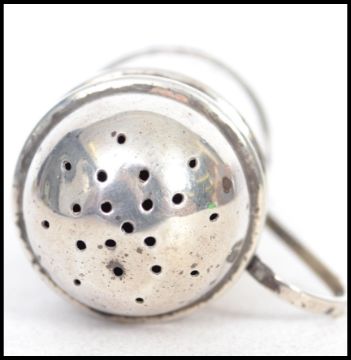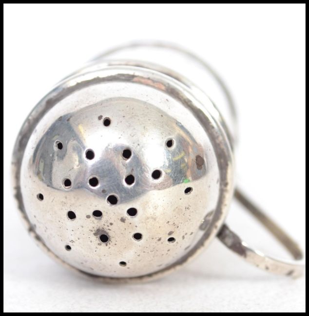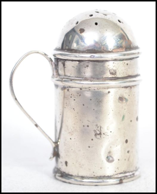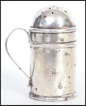 A 19th century silver hallmarked Victorian pepper shaker / pot with handle to side. Hallmarked for Chester 1898 makers Saunders and Shepherd. Weighs 15.2 grams.