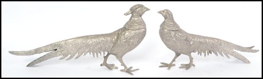 A pair of silver plated table top ornaments in the form of pheasants dating to the mid 20th century