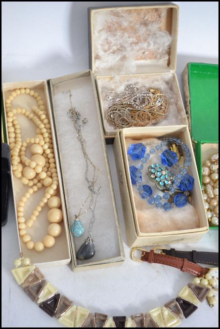 A collection of vintage costume jewellery to include silver, white metal and yellow metal necklace chains, , glass stone set, agate stone set,  bead costume and pearl set chains etc