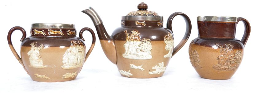 A Doulton Lambeth three piece silver mounted stone wear glazed tea service consisting of teapot, twin handled sugar bowl and creamer jug. Each decorated with figures, dogs and trees. Teapot hallmarked for Birmingham 1901 makers Oetzmann & Co, sugar bowl and creamer hallmarked for London 1888 makers Charles Shipway. Measures 21cms wide.