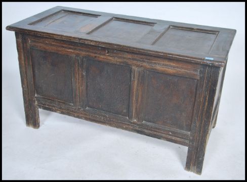 A large 18th century country oak coffer - blanket box chest being raised on tall stile supports with fielded panel body having a hinged top above with open storage set within. Measures 73cms x128cms x58cms