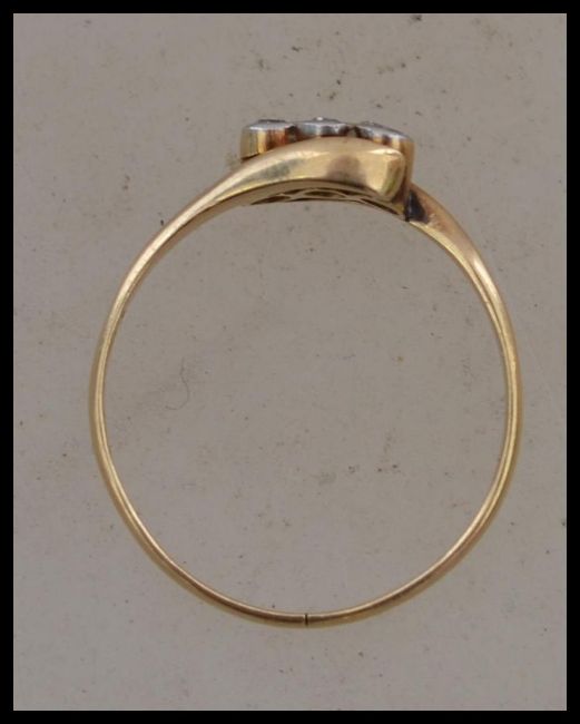 An 18ct gold and diamond ring having three bezel set diamonds in a crossover mount. Diamonds approx 12pts. Total weight 1.7g. Marked 18ct Plat, tests 18ct gold.  Size M.