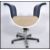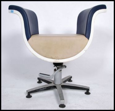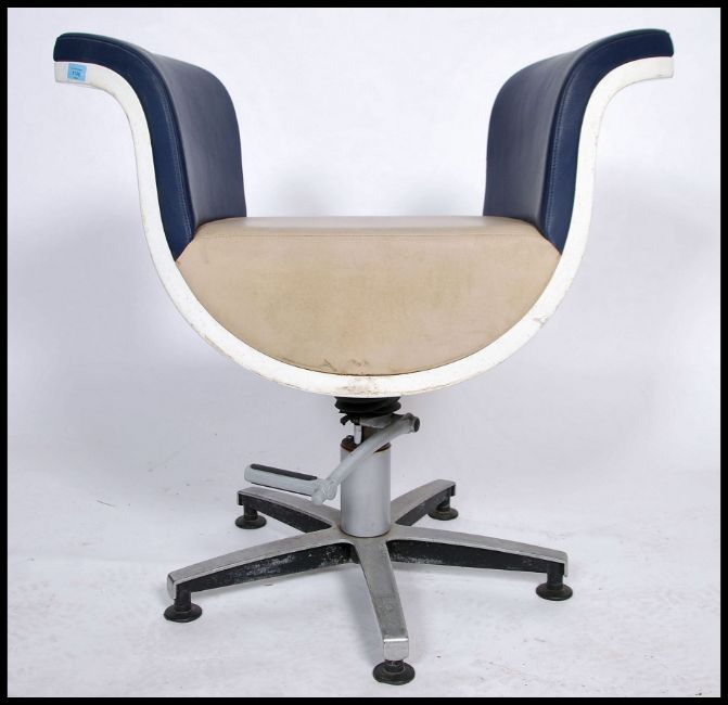 A retro 1980's large barbers gas operated swivel - rise and fall chair being raised on a circular base with foot pump having two tone open backed vinyl upholstered seat. Measures 85cm x 85cm x 50cm