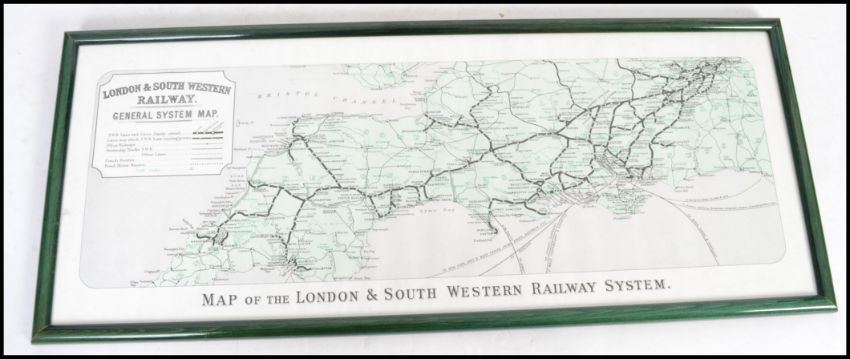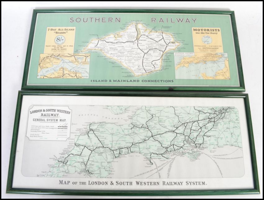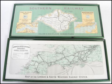 A pair of framed and glazed advertising railway maps one for Southern Railways of the Isle of Wight and one for London and South West Railways of Waterloo to Cornwall. Both measuring 66cms by 28cms.