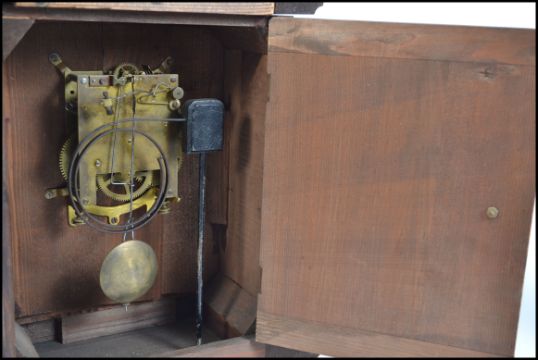 A 20th century oak cased German mantle clock having turned wood columns and finals to top, brass faced with faceted hands and decorated features to face and front. Complete with pendulum and key.