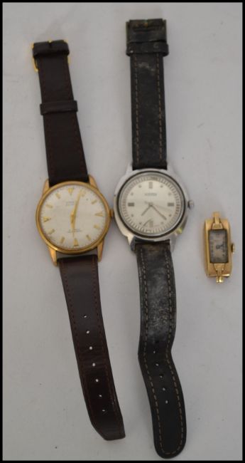 A 14ct gold ladies dress watch face by Waltham together with a gents vintage Roamer with black leather strap and a Emka Geneva wristwatch on brown leather strap