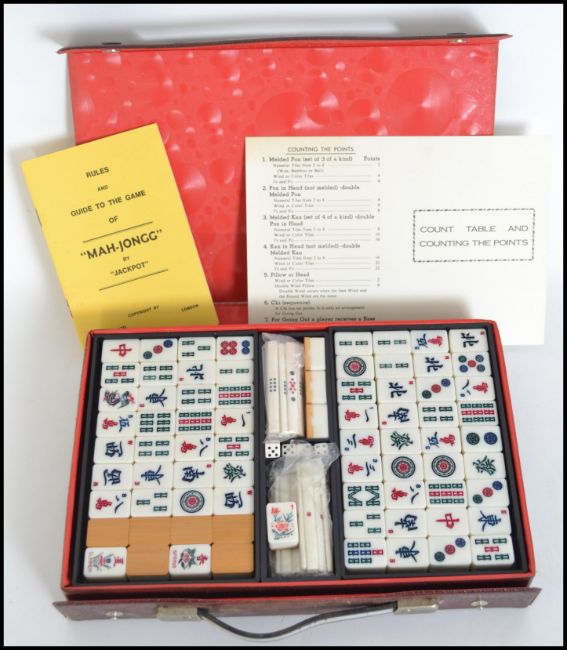 A vintage 1960s Oriental Mahjong set having wooden and resin playing pieces held within a vinyl box / carry case.