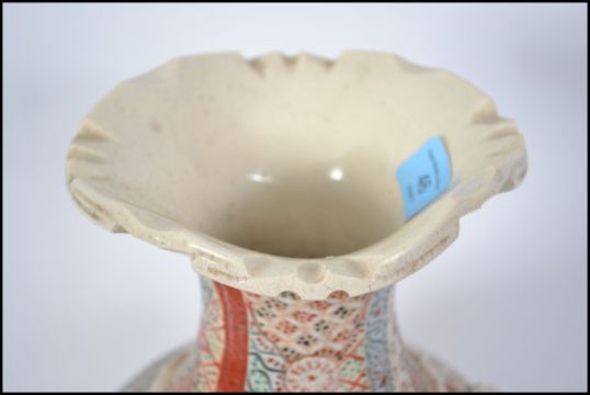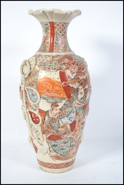 A 20th century Oriental ceramic vase having a flared rim with waisted neck and ring handles to side, depicting scenes of warriors and elders with Ochre red character marks to base. Measures 47cms high.