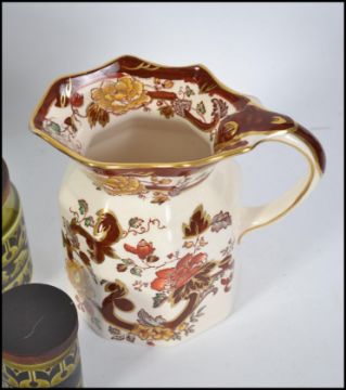 A collection of ceramics to include an Art Deco Grimwades lustre dish with orange ground together with an early Carter, Stable, Adams Poole pottery pot stamped and signes to the base, a Masons Brown Velvet jug and a selection of  retro Hornsea storage jars. Measures 27cms wide.