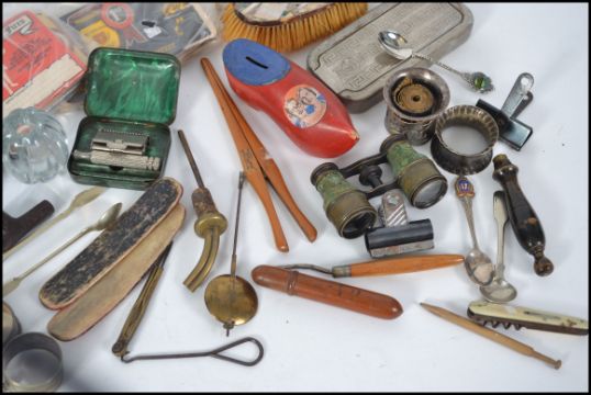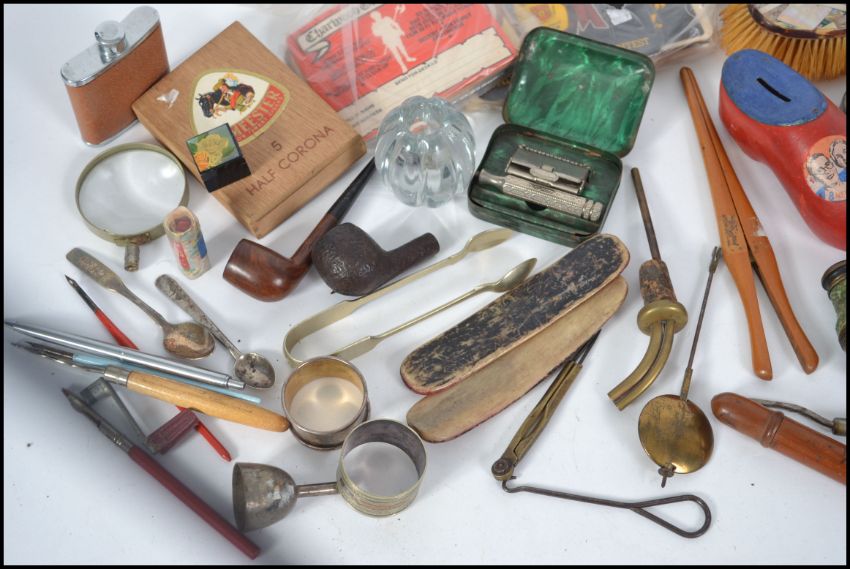 A mixed lot to include hip flask, binoculars, mother of pearl brush, glove stretchers, pipe, cigar box etc. Please see images.