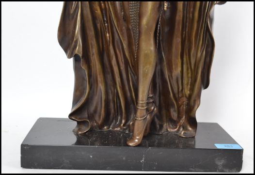 After Demitri Chaparus. A stunning Art Deco bronze study figurine of Semiramus. The bronze figure of a lady in beaded hat and dress with gown. Etched signature to the verso of the black polished marble square base. Measures 53cms high