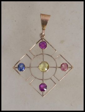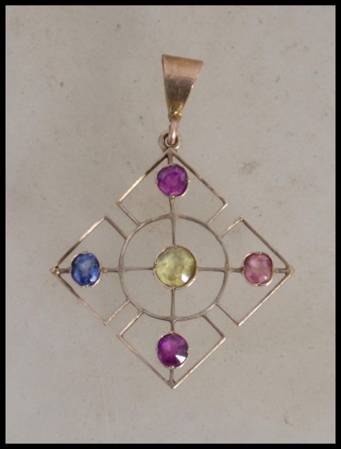 A 9ct gold Art Nouveau necklace pendant being set with coloured stones, possibly sapphires complete with bale atop. Total weight 3.2g.  Measures 4mc drop