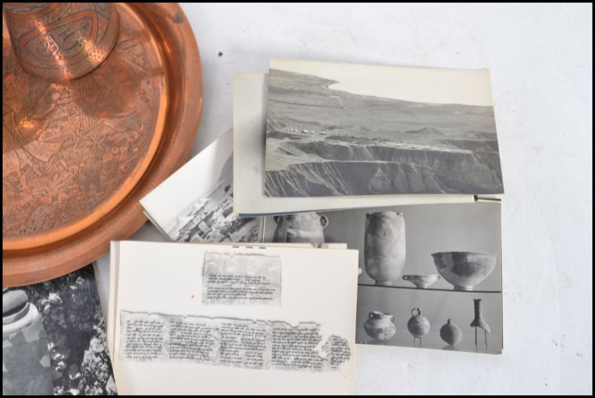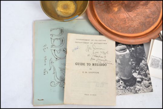 A group of Islamic copper and brass wares to include a small jug, bowl, a plate depicting a harem of women and some Islamic related ephemera.
