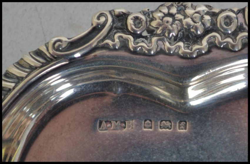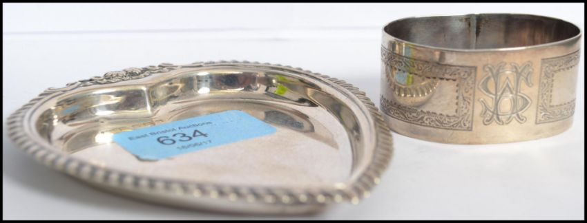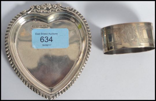 A hallmarked silver pin dish / peanut dish in the form of a heart having beveled edges and floral design to top. Hallmarked for Birmingham 1905 makers Abraham Meyer Blanckensee. Weighs 38.7 grams. Along with a Silver marked napkin ring with foliate design and geometric borders. Weighs 23.8 grams.