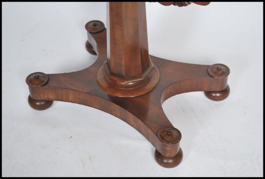 A Regency 19th century mahogany games / card table being raised on a quadruped base with inverted tapering hexagonal column supporting a flip over and swivel table top. Measures 76cms x 92cms x46cms