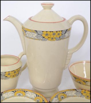 A 1930's Art Deco Newhall pottery tea service in a chintz pattern comprising teapot. cups, saucers, plates etc. Measures 20cms high.