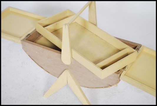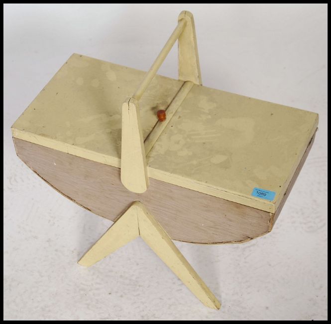 A mid century / 1950's sewing box of painted form raised on to a tapering supports with lozenge shaped body