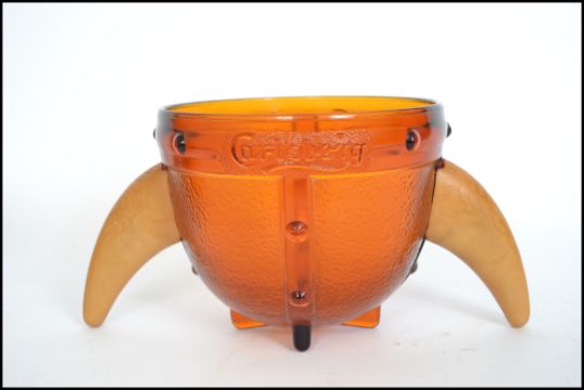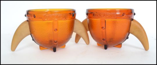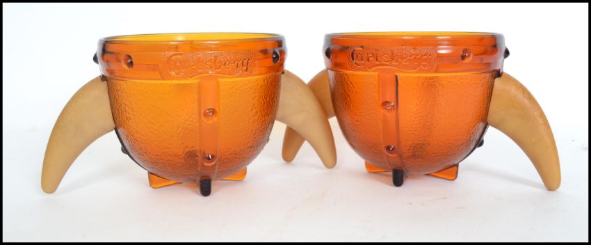 Breweriana - A pair of vintage retro Carlsberg advertising ice buckets in the form of Viking helmets. The main bowl formed from coloured pressed glass with notation for Carlsberg to the top rim. The bowls being supported by horns to the side.