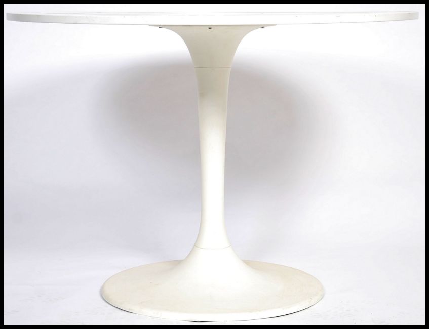 A contemporary Arkana style tulip table being raised on weighted plastic tulip base with a circular white table top above. Measures 75cm high x 105cm.