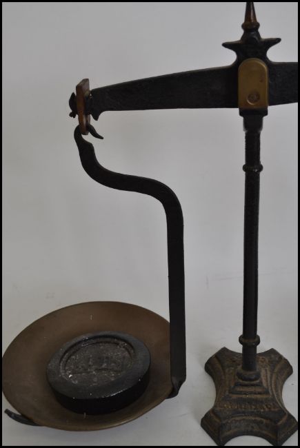 A pair of 19th century 4lb grocers cast metal balance scales fitted with a brass pan with weights. Measures 44cms high.