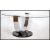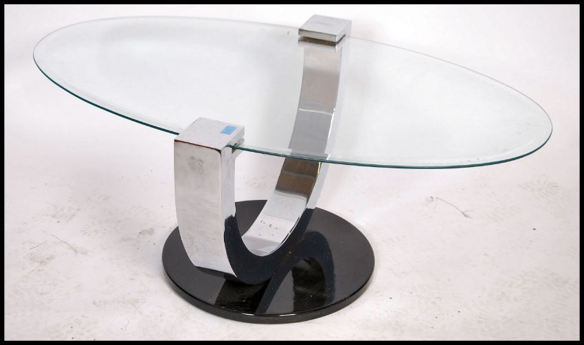 A 20th century modernist coffee table having a lozenge shaped bevelled glass table top over arched ebonised and polished steel support. Measures 50 height x 117 width x 77 depth (cm)