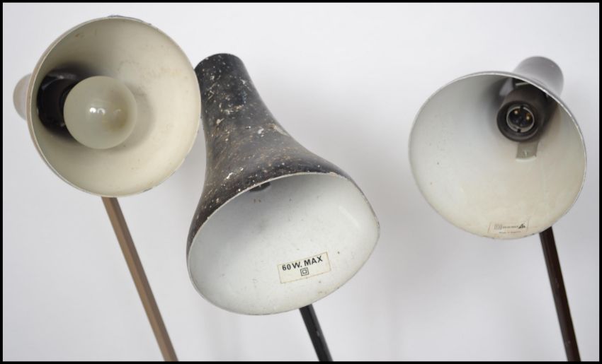 A group of three vintage retro 20th century industrial anglepoise lamps having circular bases with pendant shades. In black, mocha and brown colourways.