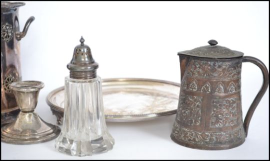 A collection of early to mid 20th century silver plated wares to include sugar shaker, stub candle sticks, wine bottle holder etc.