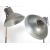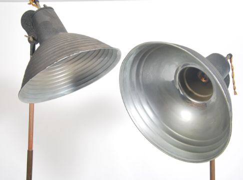A pair of retro mid 20th century photographic lights having tin reflective shades raised on adjustable metal columns with crossed supports