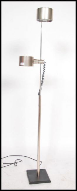 A retro mid century vintage twin spot floor standing polished steel lamp having a square base with central upright support and two shades of saucepan form.