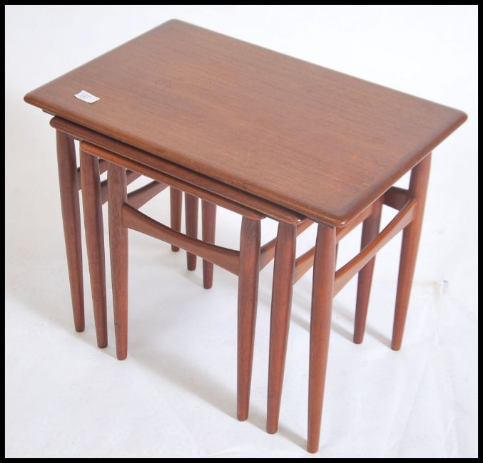 A nest of Danish 1970's Kai Kristiansen teak wood nest of tables being raised on turned legs with rectangular table tops above