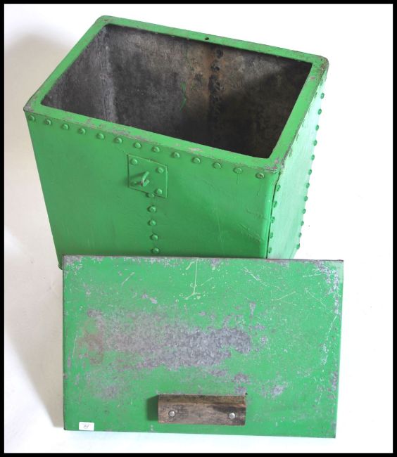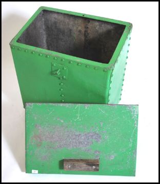 A mid century Industrial green corrugated metal green painted bird grain holder of rectangualr large form having higned top above. Measuring 75cm x 70cm x 45cm.