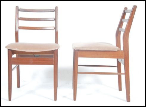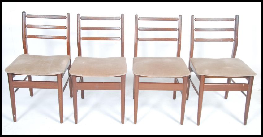A set of 4 1960's Danish Scandart teak wood dining chairs being raised on shaped legs with overstuffed seat and back rests with original labels to the underside.