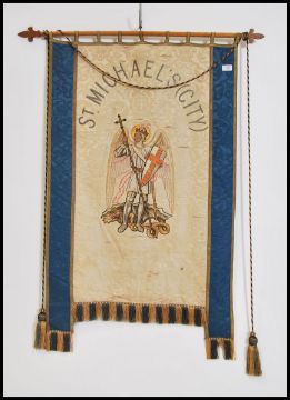 A mid century eclesiastical church drape banner for St Michaels ( city ) having hand embroidered St George and the Dragon to centre with wooden scroll top and tassled ends. Measures 72 x115 approx cms