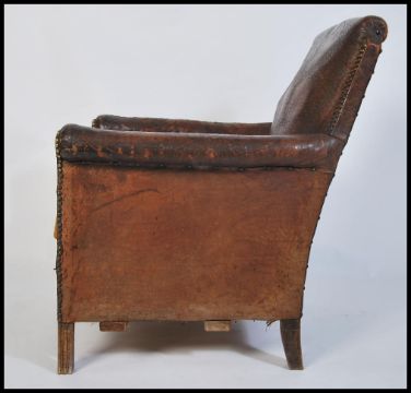 A 1930's Art Deco leather French club armchair raised on bracket feet with stunning original leather upholstery and yellow velour seat to centre