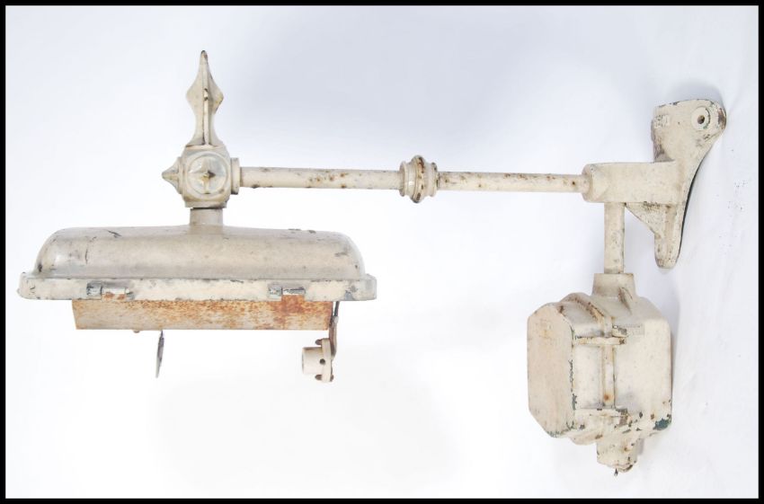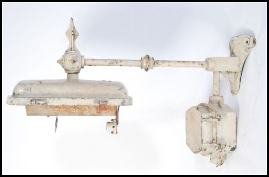A good early 20th century large cast metal street light being wall mounted having a stunning rectangular light fitting on shaped arm with wall bracket all being painted white