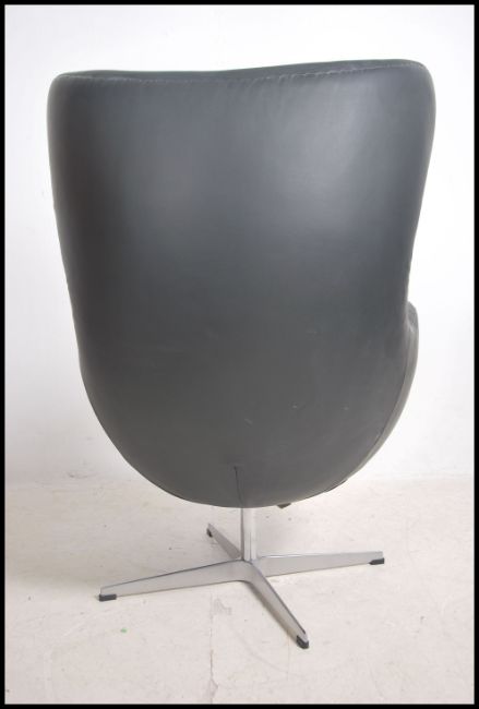 A fabulous Arne Jacobsen for Fritz Hansen style black leather upholstered Egg chair - armchair. The original being designed in 1958, Raised on a four point steel base with fire label still in place having black leather upholstery Measures 106cms high x 75cms wide x 75cms deep.