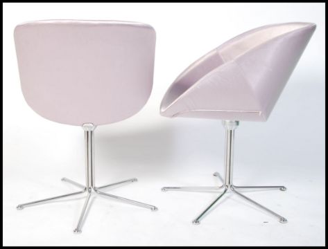 A pair of Modernist Italian Sitia Hibiscus chairs by designer Valentina Battochio. Each swivel chair beingLilac in colour. One chair is actually unused ,both chairs swivel at 360 degrees