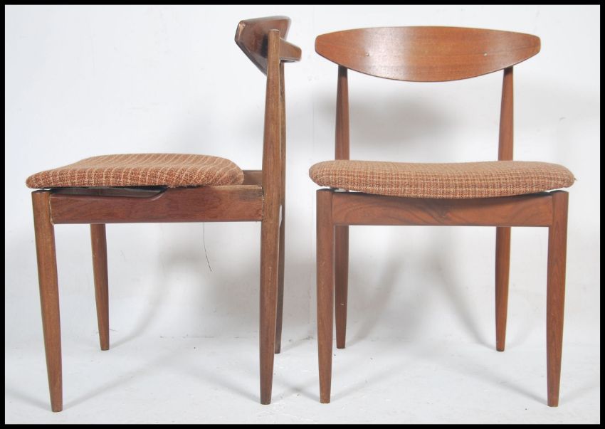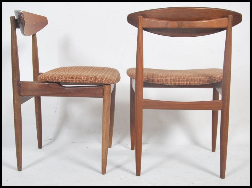 A good set of 4 mid century / 1960's Kofod Larson for G-Plan  dining chairs. The chairs being marked to the underside with gold labels and signature for Larson. Each raised on tapering legs with overstuffed believed original upholstered seats and back rests