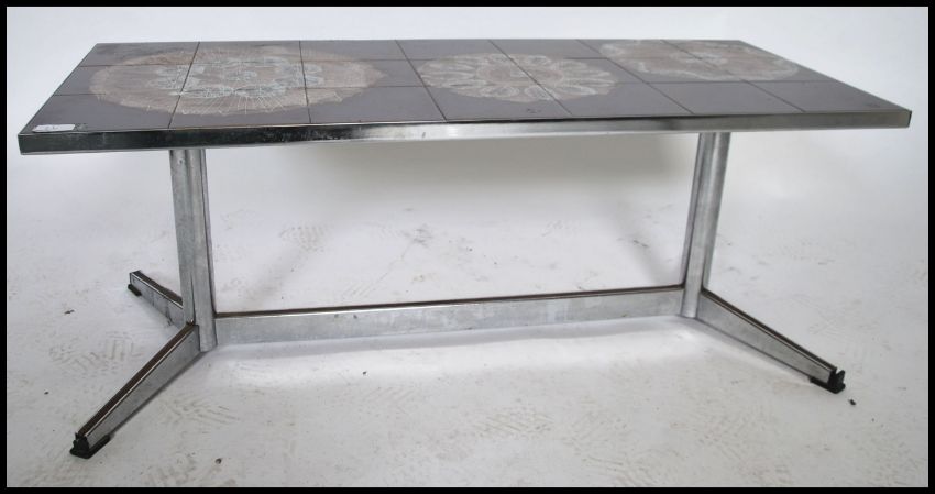 A good 1970's Danish retro chrome and tile top coffee table having stunning Fat Lava inspired tile top table with chrome supports and angular legs, inset tiled top